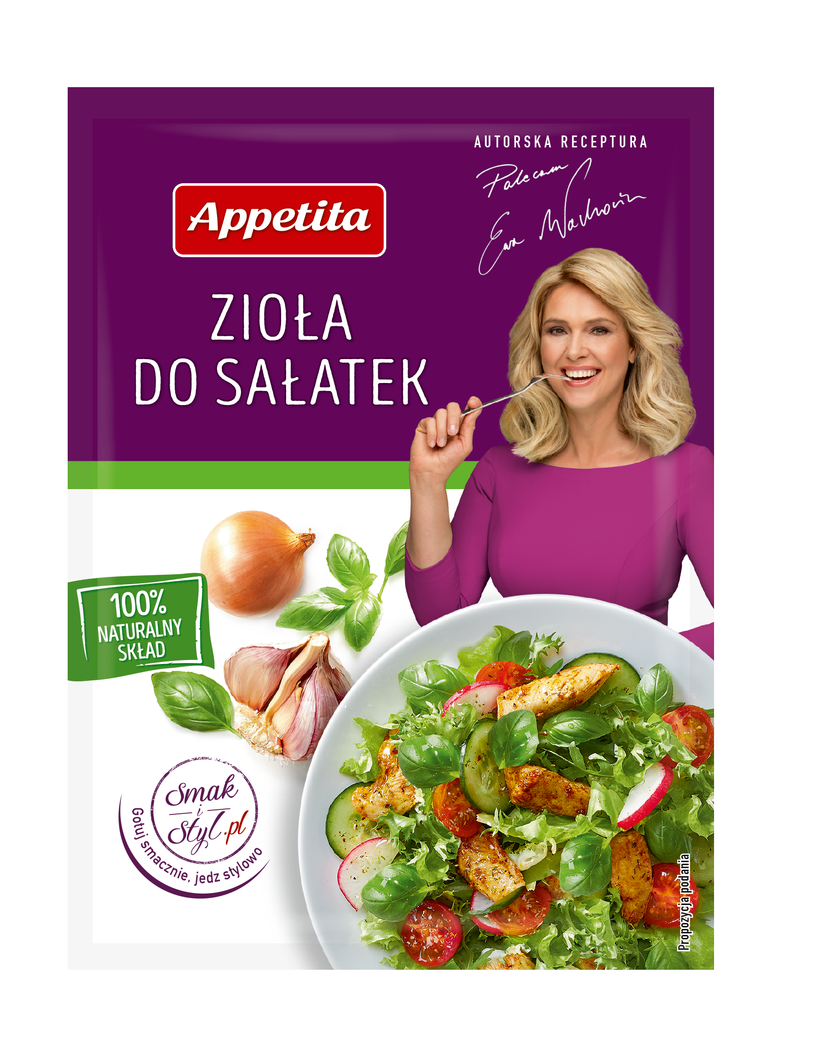 Dla osób zabieganych oraz tych, którzy chcą skorzystać z gotowych rozwiązań, idealne będą Zioła do sałatek Appetita z linii Ewy Wachowicz – autorska mieszanka ikony smaku i stylu. Kompozycja została skomponowana wyłącznie z naturalnych składników – ziół i przypraw. Nie zawiera glutaminianu sodu, maltodekstryny, konserwantów, barwników ani ekstraktu drożdżowego. Bazuje na soli morskiej, która zawiera znacznie więcej składników mineralnych i ma intensywniejszy smak niż zwykła sól kuchenna. Receptura Ewy Wachowicz znakomicie dopełnia smak warzyw ziołowym aromatem i smakiem. Doskonale doprawi różne sałatki oraz surówki np. surówkę z białej rzodkwi i marchewki, letnią sałatkę z granatem i pomarańczą, ryżową sałatkę z łososiem, jogurtowego colesława z jabłkiem i czerwoną kapustą czy sałatkę z ciecierzycą i awokado.
