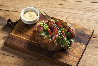 KUMPIR-PIECZONY ZIEMNIAK Z SEREM, PIKANTNĄ KIEŁBASĄ I SAŁATKĄ WARZYWNĄ