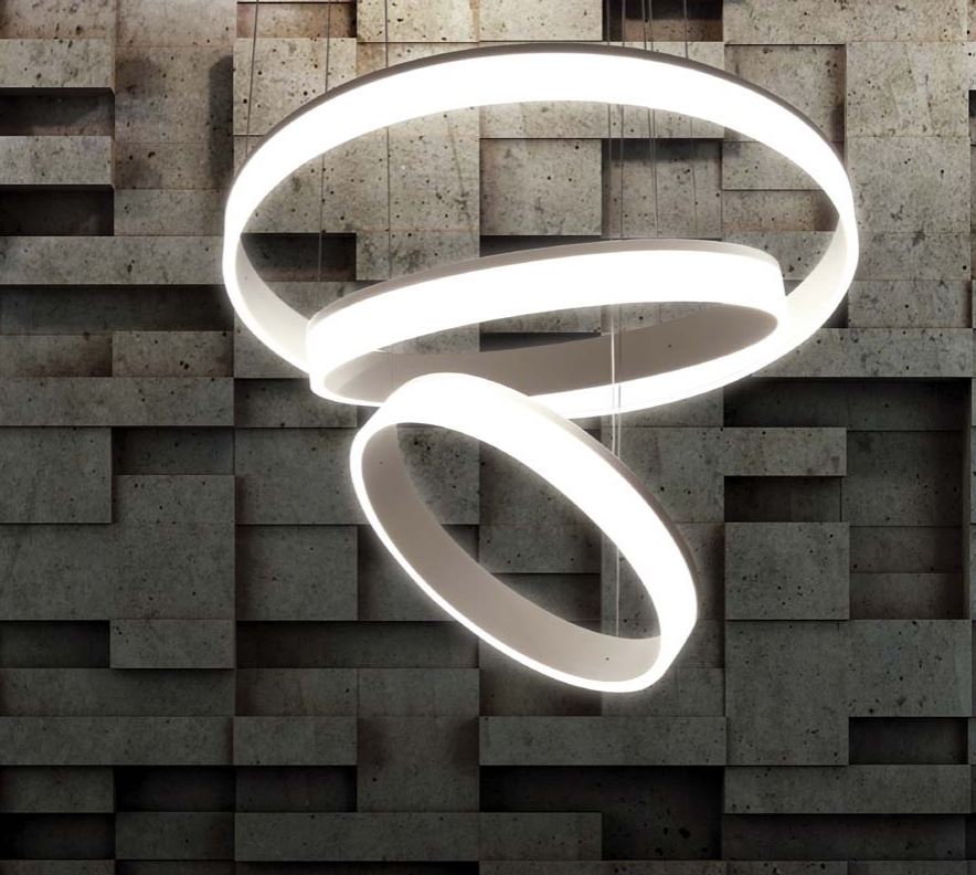 Prezentowana obok lampa ORBIT III (P0057) to nowoczesna i designerska lampa wisząca, którą tworzą trzy białe obręcze (o średnicy kolejno: 80, 60 i 45 cm) wyposażone w żarówki LED. Wykonana z metalu i akrylu, została wykończona chromowanymi detalami. Dzięki temu, że każda z obręczy montowana jest oddzielnie, możemy stworzyć prostą bądź asymetryczną, ale na pewno oryginalną formę, która doda stylu w każdym pomieszczeniu.