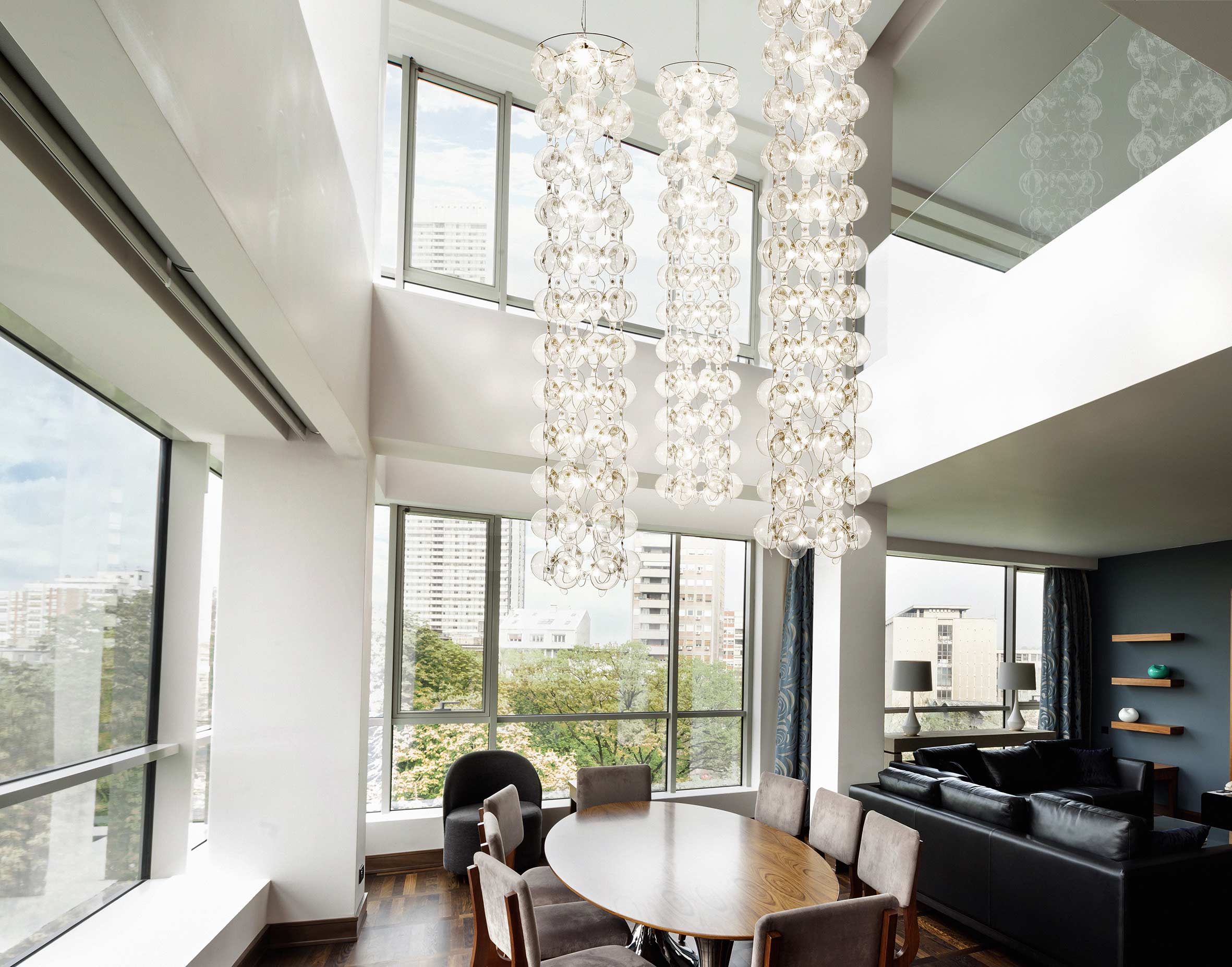 Wisząca wersja lampy High Tower od wielu już lat inspiruje i pomaga kreować wyjątkowe przestrzenie. To delikatna, bąbelkowa konstrukcja przywodząca na myśl wieżę królewskiego zamku. High Tower w nowej odsłonie, uwolniony od zależności od stropu, możemy ustawić dowolnie, oświetlając i dekorując także niższe partie wnętrza!