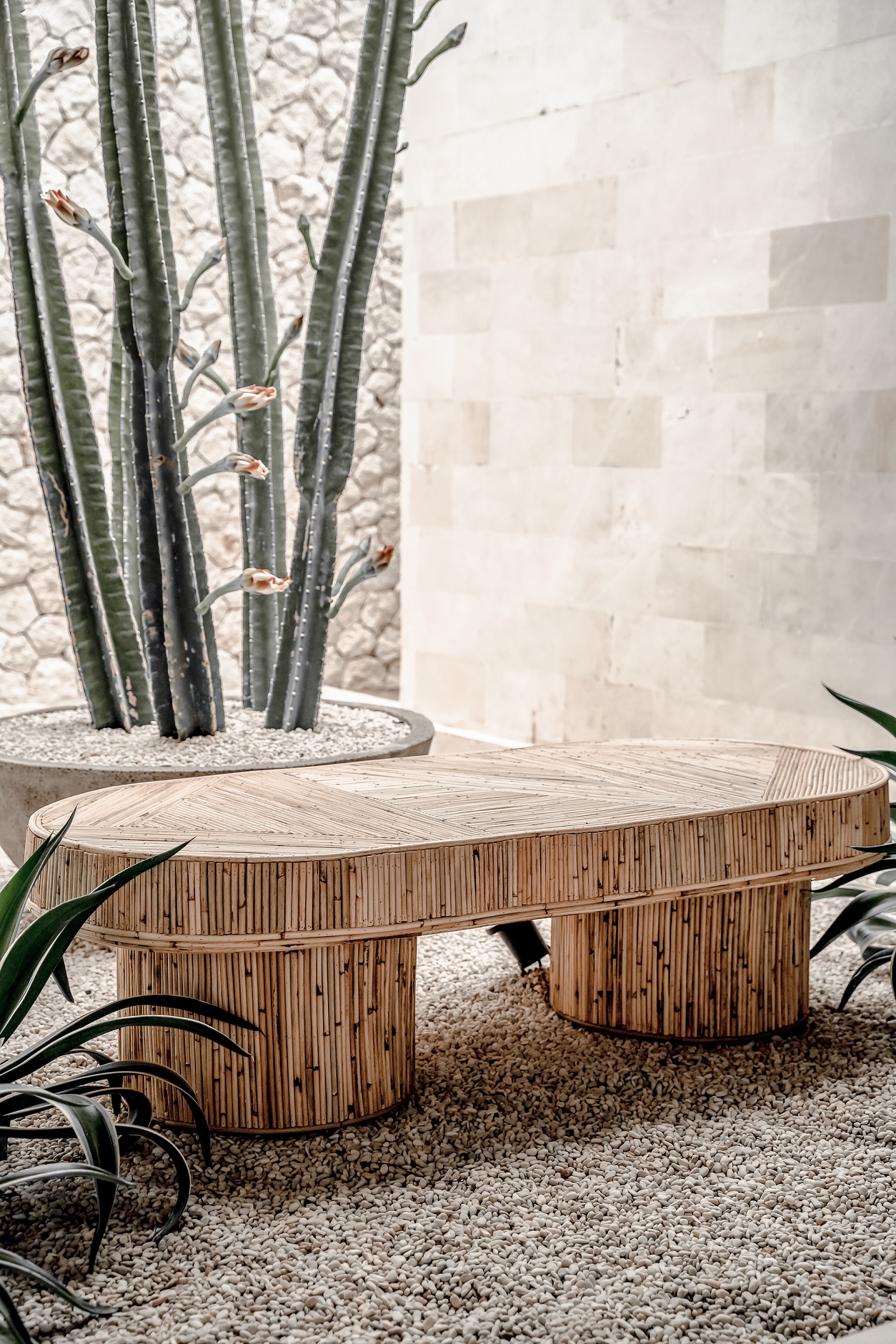 Stół Monnarita Alia – w odcieniu miodowego brązu, to przykład perfekcyjnego połączenia tradycji z nowoczesnością. Klasyczny podłużny kształt i ręczne wykonanie w 100% z naturalnego rattanu wysokiej jakości sprawiają, że spodoba się tym, którzy w aranżacji wnętrz stawiają na naturalne materiały i proste formy. Jednocześnie, stanowiące blat przecinające się abstrakcyjnie trójkąty, nadają stolikowi odrobinę ekstrawagancji. Ale spokojnie – drinki z palemką będą stały na nim stabilnie!