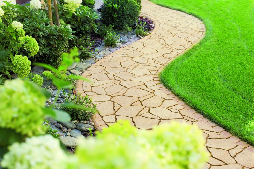 Alternatywą do klasycznych alejek w ogrodzie jest wykonanie ścieżek metodą step by step. Polega ona na układaniu prefabrykatów betonowych w pewnych odległościach od siebie i z lekkim przesunięciem, tak jakbyśmy stawiali kroki idąc na spacer. Decydując się na to rozwiązanie, należy pamiętać, że dystans pomiędzy poszczególnymi płytami nie może być większy niż 60 cm! To ważne, gdyż ma to decydujący wpływ na wygodę poruszania się po tego rodzaju deptaku. Do jego wykonania możemy użyć płyt Polbruk Linea przypominających fakturą i wyglądem trawertyn, czyli porowatą skałę osadową, z której wybudowano m.in. rzymskie Koloseum. Linea jest dostępna w dwóch kolorach: jasnoszarym i beżowym, które świetnie komponują się z intensywną zielenią trawnika.