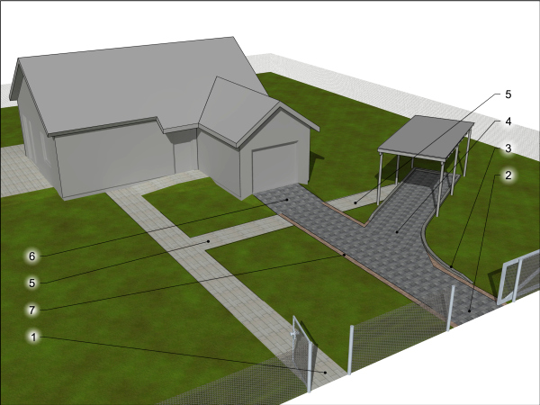 Ostatni typ to wiata wolno stojąca. Najmniejsza i zdecydowanie najprostsza konstrukcyjnie, jednak wbrew temu co można by przypuszczać – zajmująca na działce zdecydowanie najwięcej wolnej przestrzeni. Może jednak stanowić również doskonałe optyczne odcięcie np. „technicznej” części terenu od reprezentacyjnego ogrodu. Trzeba pamiętać o zapewnieniu wygodnego dojścia i dojazdu zapewniającego komfortowe parkowanie bez konieczności wykonywania zbyt trudnych manewrów. Ze względu na minimalną szerokość raczej nie znajdują zastosowania boczne pasy z kostki o ostrej fakturze. Pozostałe elementy pozostają w zasadzie takie same jak w dwóch poprzednich rodzajach zadaszeń. Boczne prowadnice z wysokich krawężników warto usytuować w najmniejszej bezpiecznej odległości – tak, aby parkując nie zahaczyć o konstrukcję lusterkiem ani żadnym innym wystającym elementem. Dzięki temu wiata zajmie minimalny możliwy obszar. Z kolei tylny ogranicznik warto usytuować w taki sposób, aby cały zaparkowany samochód znajdował się pod zadaszeniem. W wypadku większości samochodów oznacza to, że powinien być przesunięty o co najmniej metr w stosunku do tylnej krawędzi dachu.